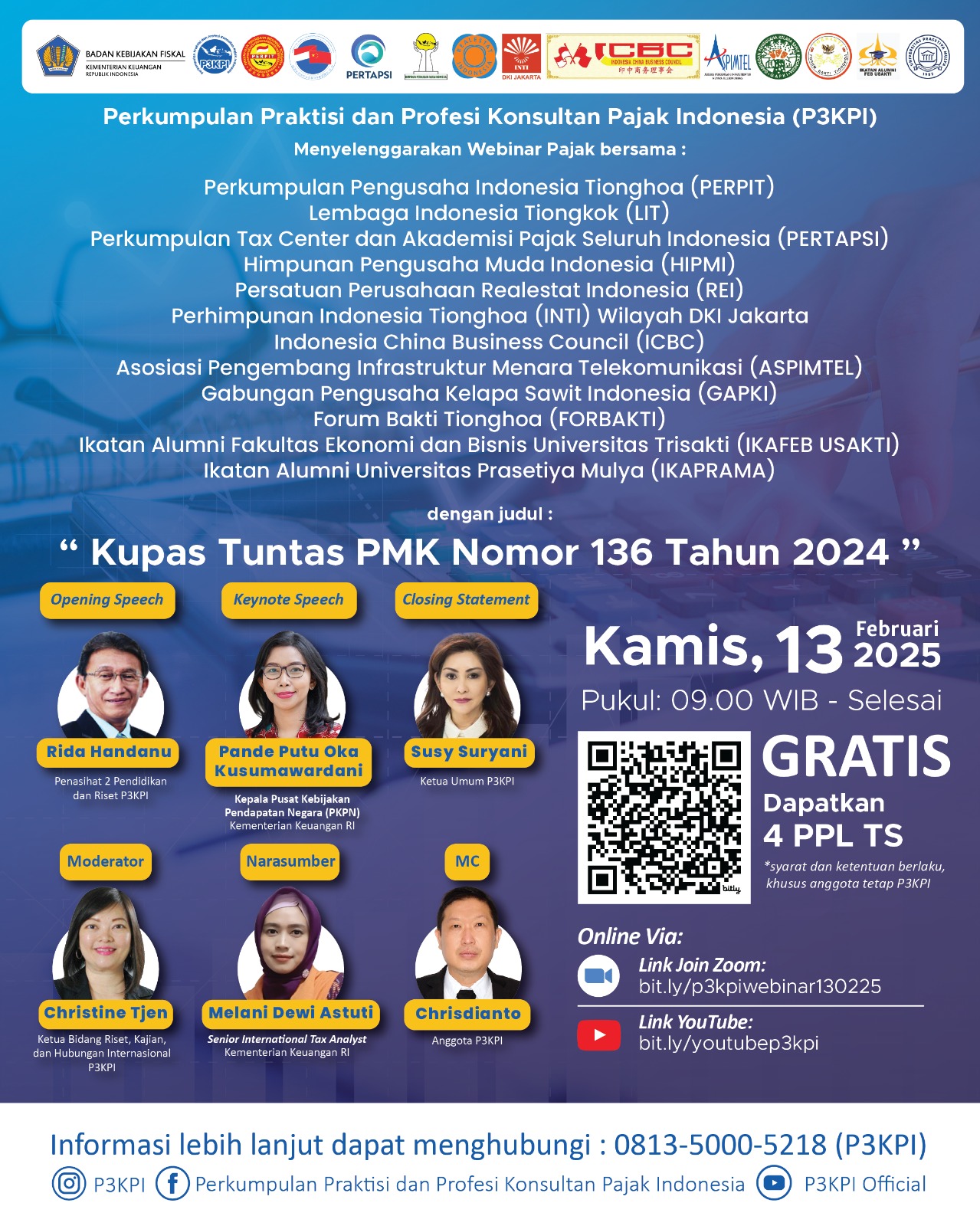 Perkumpulan Praktisi dan Profesi Konsultan Pajak Indonesia (P3KPI) menyelenggarakan Webinar Pajak bersama :