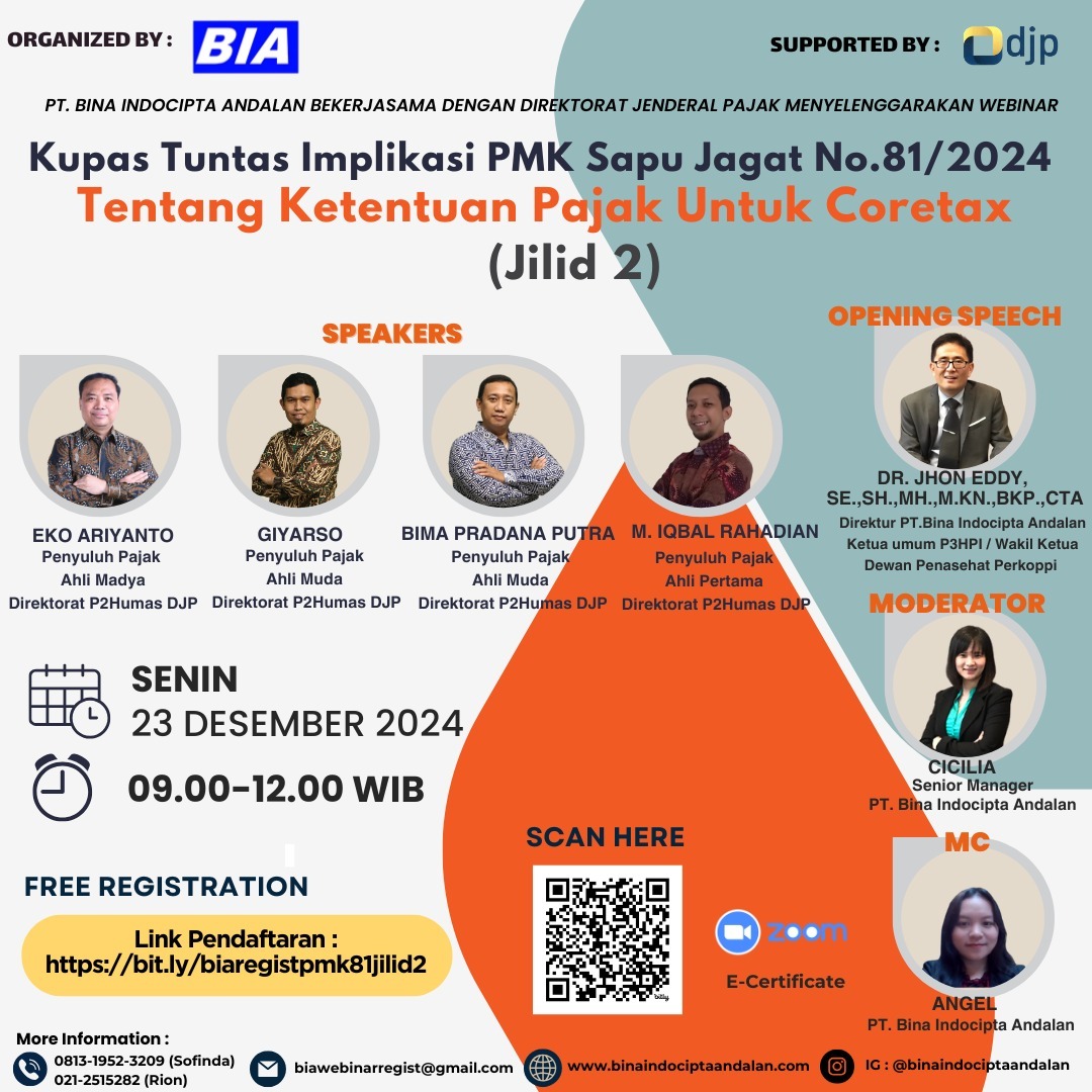 PT. Bina Indocipta Andalan bekerjasama dengan DJP mengadakan webinar dengan judul “Kupas Tuntas Implikasi PMK Sapu Jagat No. 81/2024 Tentang Ketentuan Pajak Untuk Coretax (Jilid 2)”