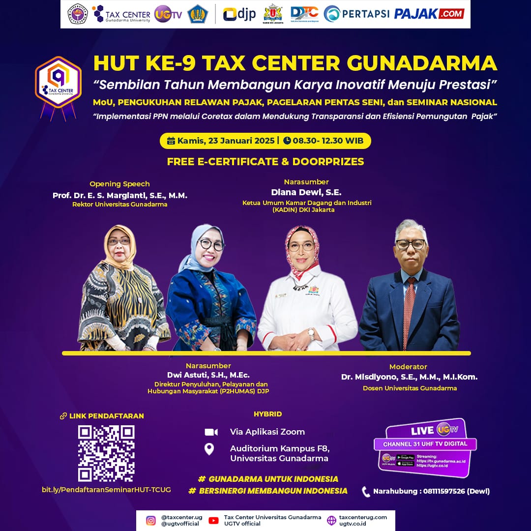 Dalam rangka memperingati hari ulang tahun, Tax Center Universitas Gunadarma menyelenggarakan kegiatan “HUT KE-9 TAX CENTER GUNADARMA” dengan tema “Sembilan Tahun Membangun Karya Inovatif Menuju Prestasi”. Adapun salah satu rangkaian kegiatannya adalah Seminar Nasional Perpajakan bertajuk “Implementasi PPN melalui Coretax dalam Mendukung Transparansi dan Efisiensi Pemungutan Pajak” yang akan diselenggarakan pada:
