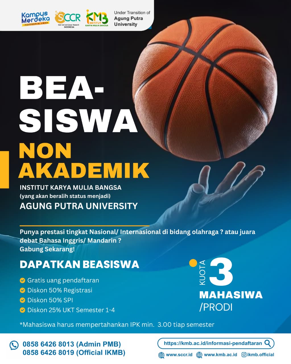 IKMB/Agung Putra University menawarkan kesempatan emas bagi mahasiswa berprestasi di bidang non-akademik untuk melanjutkan pendidikan tinggi dengan beasiswa menarik. Beasiswa ini mencakup gratis uang pendaftaran, diskon biaya registrasi, diskon SPI, dan diskon UKT semester 1-4.