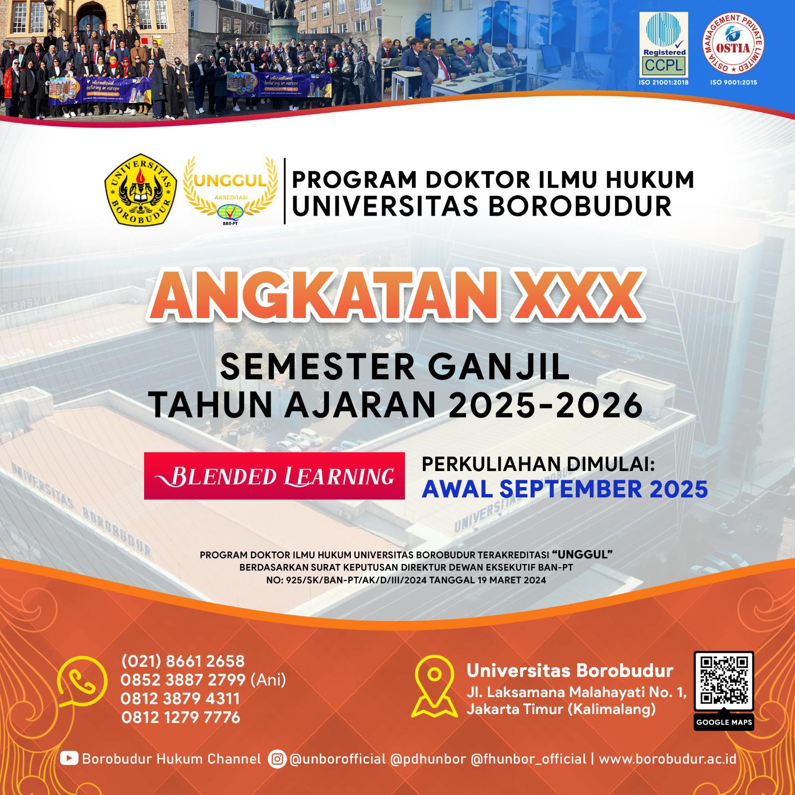 Universitas Borobudur, sebagai institusi pendidikan tinggi yang memiliki komitmen terhadap kualitas, secara aktif merespons kebutuhan akan pendidikan hukum tingkat lanjut dengan membuka pendaftaran untuk Program Doktor Ilmu Hukum Angkatan XXX pada Semester Ganjil Tahun Ajaran 2025-2026. Program ini dijadwalkan untuk memulai perkuliahan pada bulan September 2025, menawarkan kesempatan bagi para profesional dan akademisi di bidang hukum untuk melanjutkan pendidikan ke jenjang tertinggi. Keberadaan program doktor di Universitas Borobudur menunjukkan dedikasi institusi untuk memajukan keahlian hukum dan berkontribusi pada lanskap intelektual hukum di Indonesia.