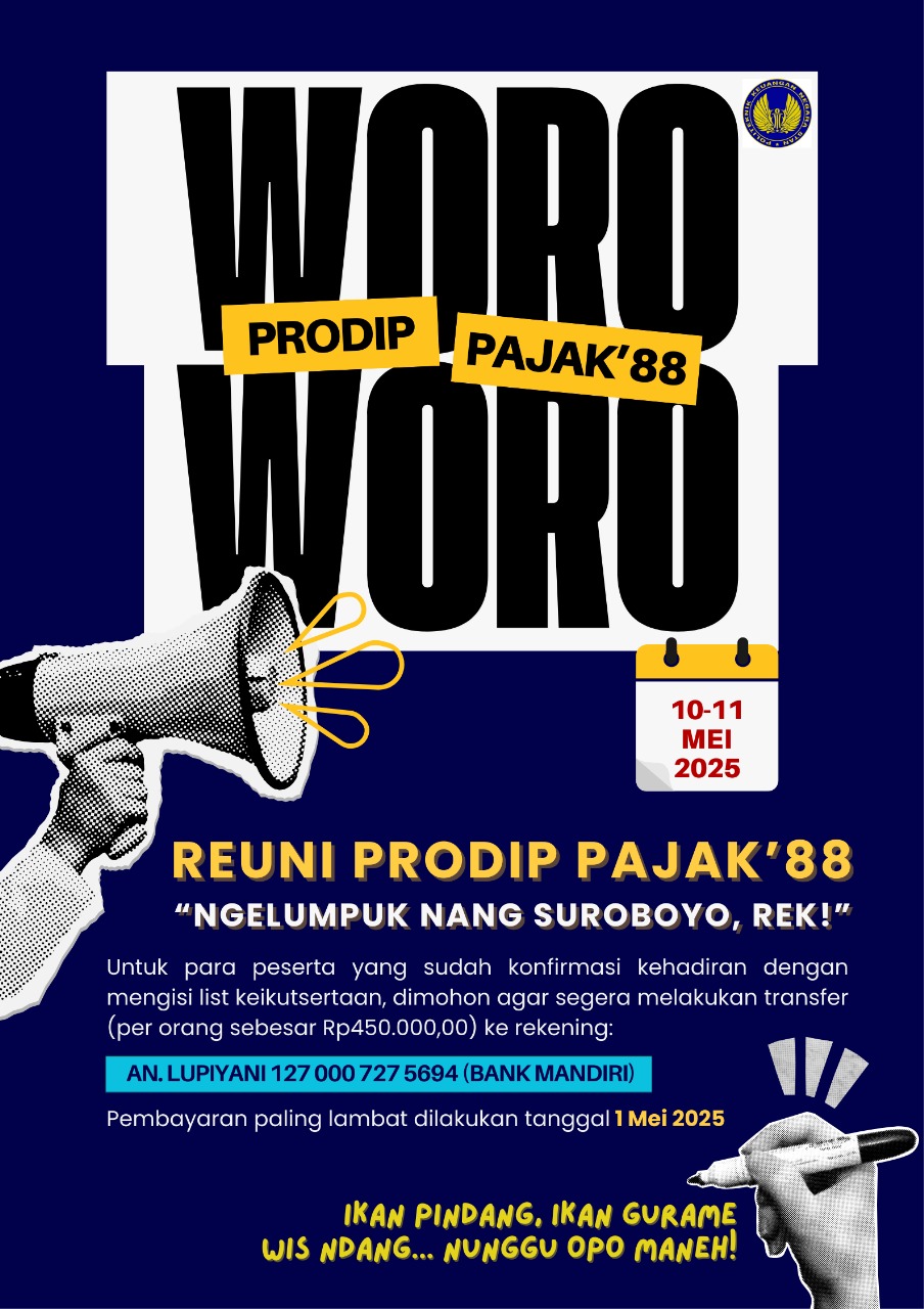 Tanggal 11–12 (Ralat: sing bener Tanggal 10-11) Mei 2025, Suroboyo dadi saksi kangen-kangenan paling meriah sak jagad alumni Prodip Pajak ’88! Siji-sijine momen yang gak bakal terulang, gak bakal bisa ditonton ulang di YouTube!